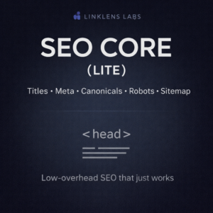 LinkLens Labs Docs SEO Core (Lite) Low-overhead SEO that outputs correct essentials: titles, meta descriptions, canonicals, robots directives,…